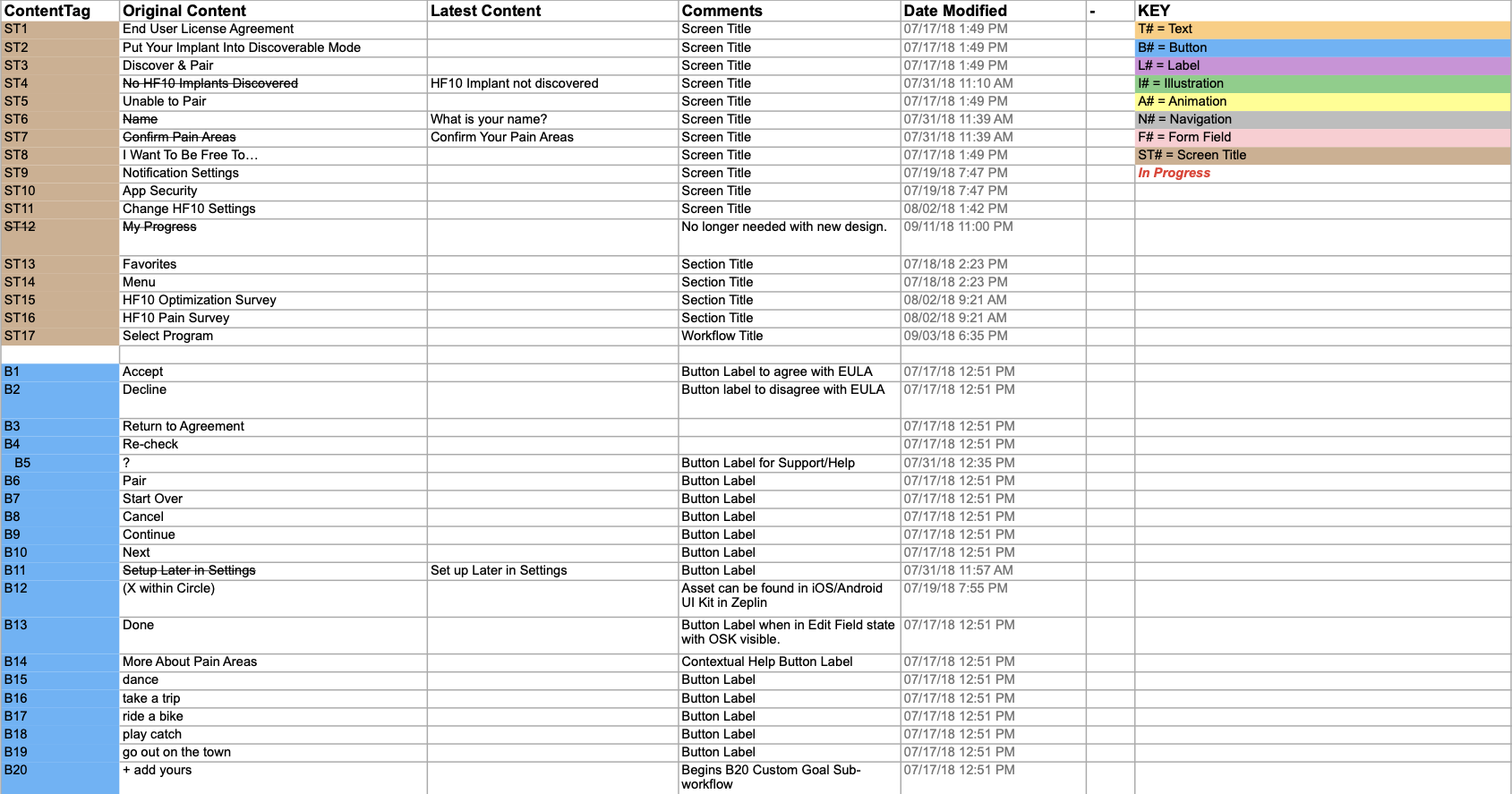 I proposed that we start using a simple version of a content inventory, comprised of a spreadsheet which would act as the source of truth for all copy/content in the app that would be shared with the client. Each line in the spreadsheet would have its own unique content ID, which in turn would have a corresponding content tag in the wireframes.