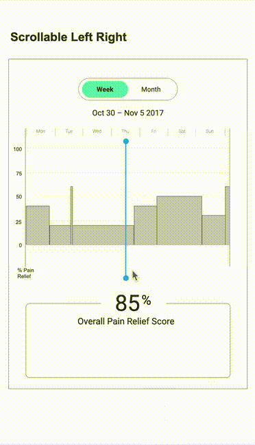 Middle: Represents a concept exploring swiping/scrolling horizontally to browse through pain relief scores on a weekly or monthly basis.
