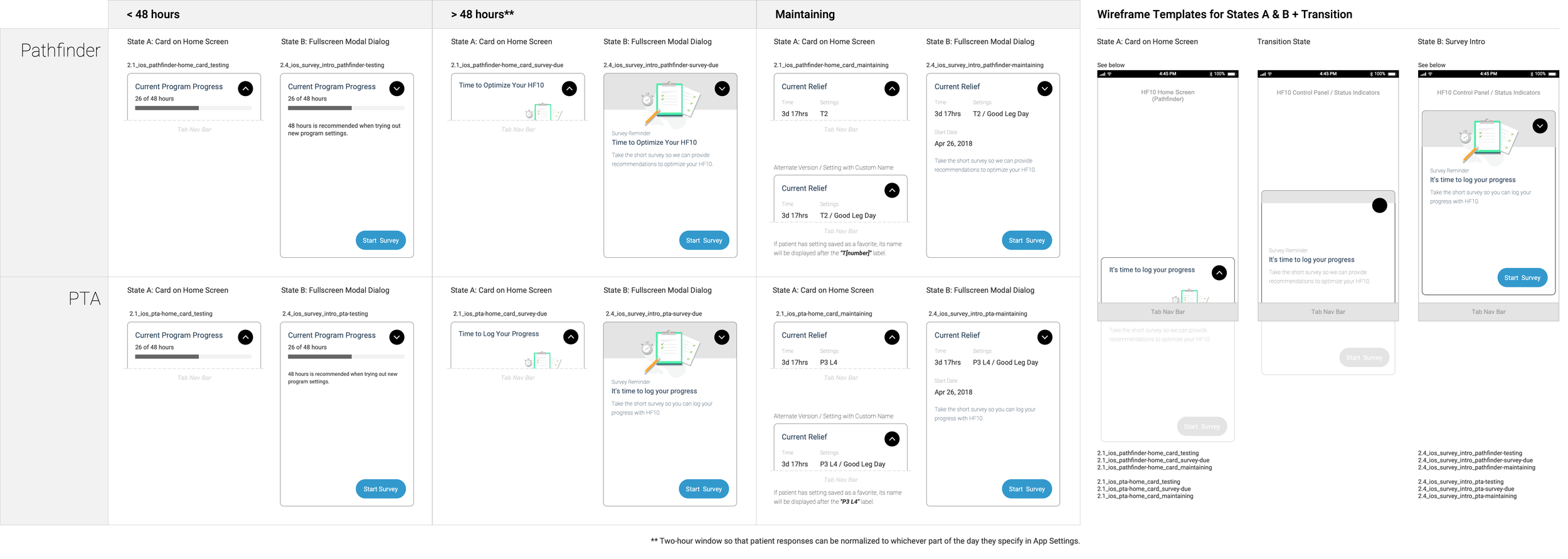 In this first month, Nevro wanted to make sure the patient had time for the program/level’s efficacy to take hold before prompting feedback via the survey. This is represented below under the 48 hr time window in the first column. Once that window of time has elapsed, the patient is prompted to take the survey via the app’s home screen (and also via notifications if they’re not in the app when that condition takes place). To ensure timeliness of feedback, they’re given a 2-hour window to take the survey.